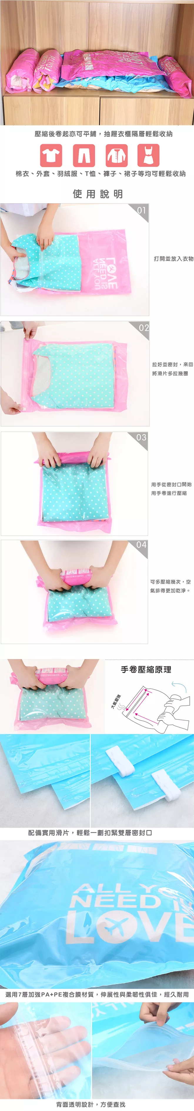本品操作簡單,以手捲的方式,將收納袋內空氣擠壓出來,配合迴路氣道,再利用PA(尼龍)+PE(聚乙稀)的物質自黏性,將氣口鎖住,達到真空效果!