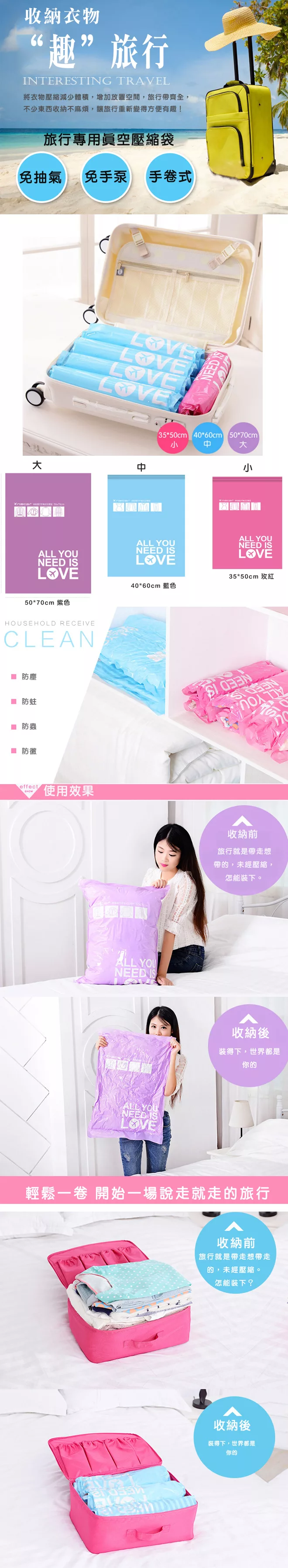 有了本品手卷式真空壓縮袋組,出行一切無憂!