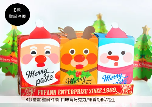 聖誕許願禮盒組,盛裝巧克力醬(聖誕老公公)、花生醬(西米鹿)、椰香奶酥(啾咪雪人)三種paste經典抹醬,最新推出經典款花生醬,美味嚴選聖誕聚獻。許願禮盒DIY立體開盒設計,可當聖誕吊飾、亦可在盒背上寫下心中的話,俏皮可愛,怎麼擺放都充滿聖誕氣氛,傳遞你的願望與祝福!許願禮盒多樣玩法等你來發掘!可拆開各別送人,是聖誕節Party最佳的交換禮物!