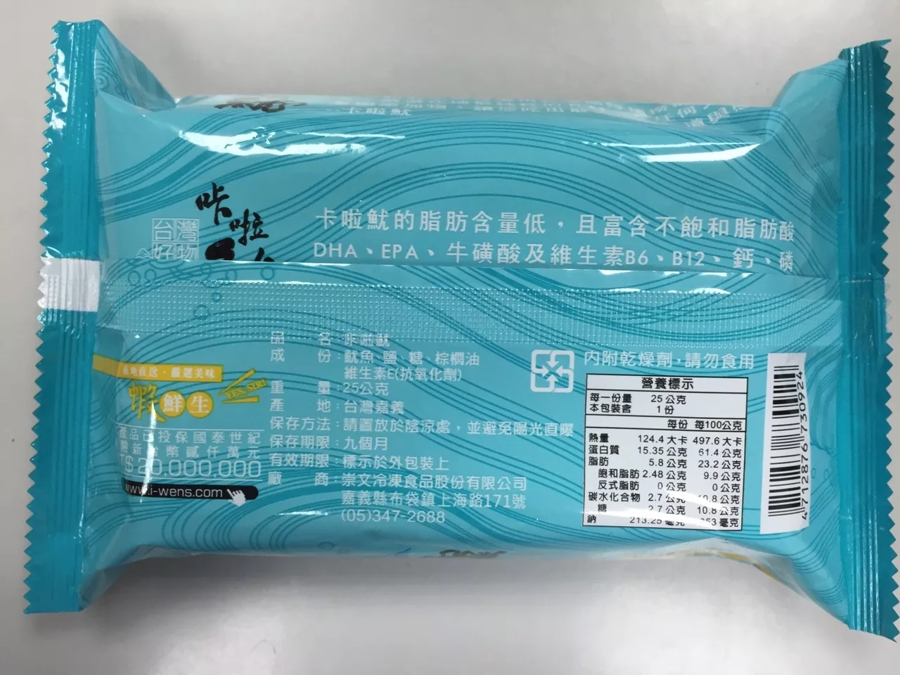 成份:魷魚、鹽、糖、棕櫚油、維生素E(抗氧化劑)。