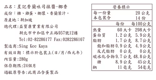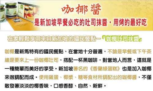 商品推薦:《新加坡風味館》香蘭吐司抹醬280g-瓶(椰香)