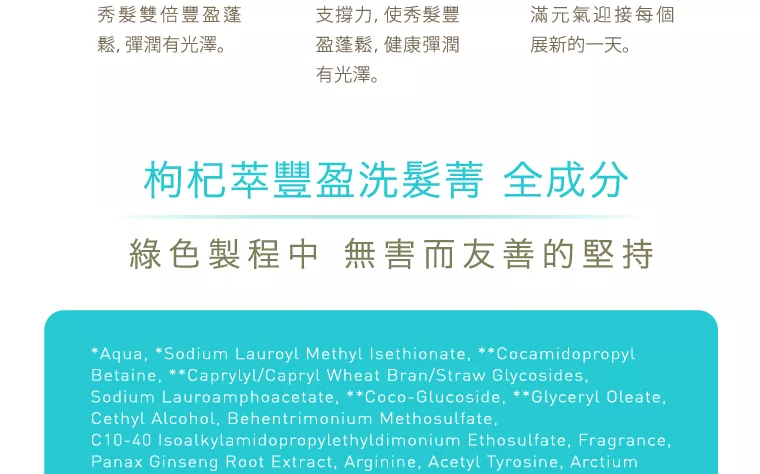 - 有機認證枸杞萃取添加,可調理頭皮油脂,強化髮根支撐力,使秀髮輕盈蓬鬆。